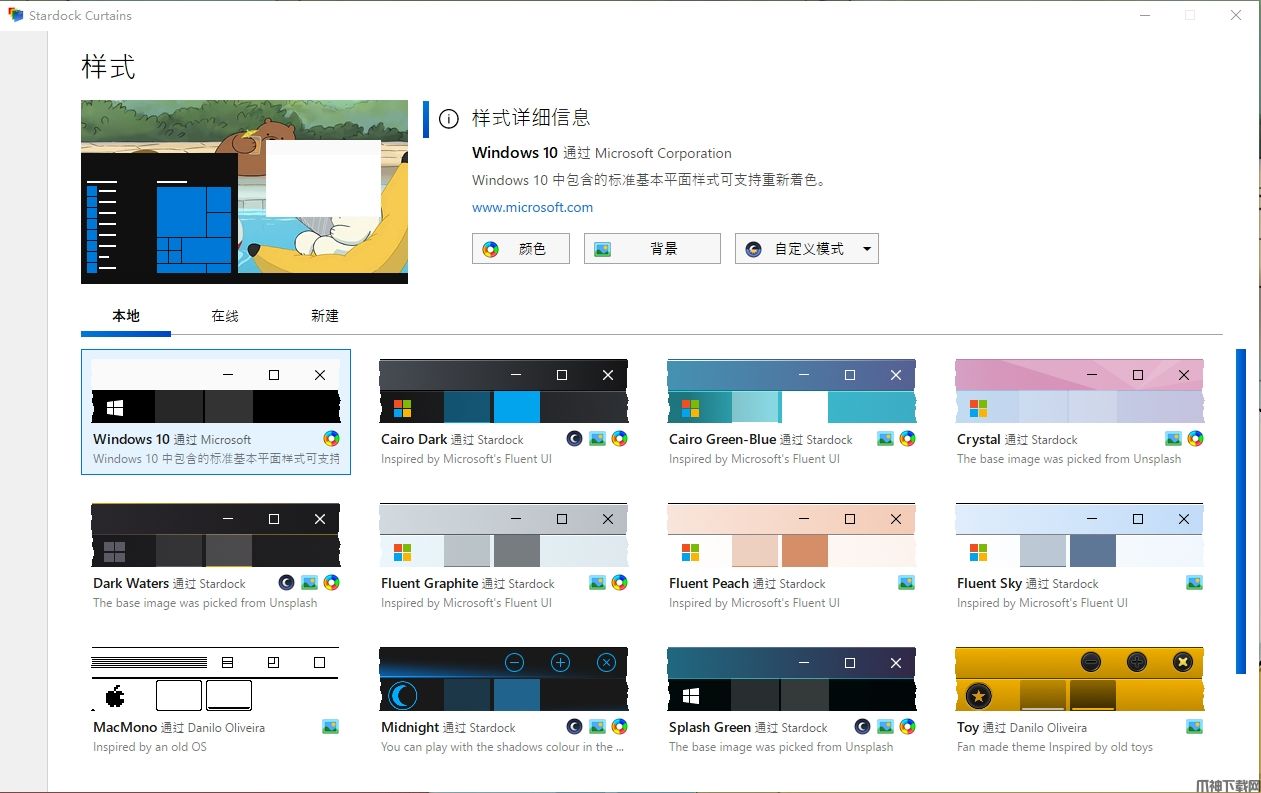 Stardock Curtains官方版是一款Win10主题美化工具,它可以修改内置的样式,包括调整渐变、标题栏按钮和标题栏颜色等样式,而且它还支持用户将自己的Win10修改成Win xp或者是Win7的主题界面,还能够将下方的操作任务栏变成透明,自定义设置,十分好用。有需要的用户欢迎下载使用。