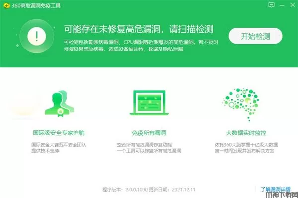 360高危漏洞免疫工具官方版是一款性能优秀、行内最为专业的漏洞免疫修复工具,能够帮助用户快速检测出电脑上的高危漏洞,包括勒索病毒漏洞、CPU漏洞、WinRAR漏洞、远程桌面漏洞等等多项高危漏洞,并且帮助用户轻松修复漏洞,解决电脑安危问题。360高危漏洞免疫工具使用起来非常简单,运行程序后点击开始检测,如若检测出有高危漏洞的情况,点击相应的修复,即可一键修复高危漏洞。软件完全免费,无需安装,随时随地保护电脑安全,保障用户隐私,有需要的朋友,欢迎下载体验。