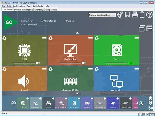 BurnInTest测试CPU, 硬盘,SSD,RAM, 光驱(CD,DVD和蓝光),声卡, 图形卡(GPGPU,视频RAM,2D图形,3D图形和视频播放),网络端口和打印机。