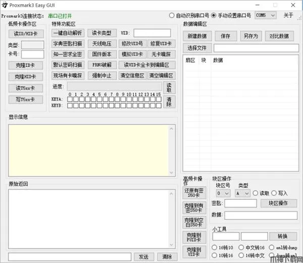 Proxmark3软件全称Proxmark3 Easy GUI,它是一款可搭配Proxmark3硬件使用上位机调试工具,它拥有独立的图形化界面版本,支持修改各种IC卡,支持用户进行RFID破解、一键自动解析、字典密钥扫描、无卡嗅探等操作。