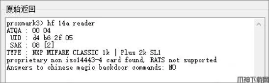 5、高频天线电压下降非常明显,这就说明我们现在所持有的卡片为高频IC卡,下面尝试对器破解,首先先读取卡片类型。