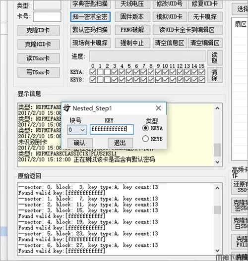 9、这是利用嵌套认证漏洞使用任何一个扇区的已知密匙,获取所有扇区的密匙,此漏洞成功率较高,这个漏洞也被称作知一密求全密,我们现在已经知道其中的几个扇区的默认密码