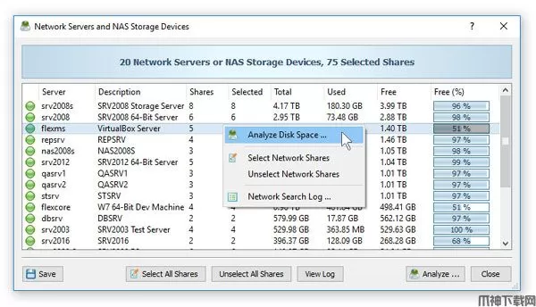 为了分析一个或多个服务器或NAS存储设备,请按主工具栏上的“网络”按钮,然后等待DiskSavvy扫描网络并显示检测到的网络服务器和NAS存储设备的列表。在网络服务器和NAS存储设备对话框中,选择所需的服务器,然后按“分析”按钮。