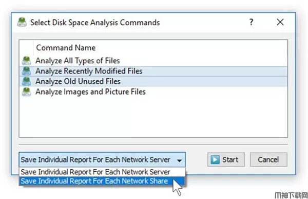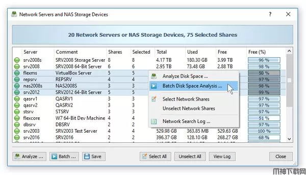 在最简单的情况下,只需按主工具栏上的“网络”按钮,搜索网络上的所有网络服务器和NAS存储设备,选择一台或多台要分析的服务器,按鼠标右键并选择“批处理磁盘”空间分析”菜单项。Disk Savvy Pro将显示一系列预配置的磁盘空间分析命令,使您可以选择一个或多个要在所有选定的网络服务器和NAS存储设备上执行的命令。