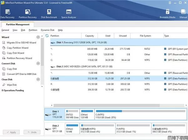 MiniTool Partition Wizard是一款功能强大的磁盘分区管理工具,软件可以帮助用户在电脑上恢复分区丢失的数据,也可以在软件为当前的电脑设置新的分区,也可以转换磁盘类型,软件界面的功能非常多,大部分都是针对分区管理开发,让用户在配置电脑分区以及管理存储设备的时候活动更多功能。软件可帮助您在Windows分区上执行许多驱动器管理功能,如复制,合并,扩展,擦除,删除,格式化或切割;软件向导可以轻松地对磁盘进行分区和格式化硬盘,浏览磁盘卷的容量范围,以及在磁盘卷和硬盘之间进行复制;软件支持Linux Ext2,Ext3,Ext4文件系统,32位/ 64位Windows操作系统,一个系统中最多32个硬盘,甚至最大容量为2TB的硬盘;软件可以在不重启系统的情况下对分区进行更改,由于恢复模式,没有数据丢失选项;软件只需使用Windows磁盘管理工具,一旦创建分区,就无法调整大小,更改序列号和分区ID等,因此为了更好的控制和灵活性,我们需要一个第三方软件,其设施可以让我们安全地执行一个数字分区管理活动。