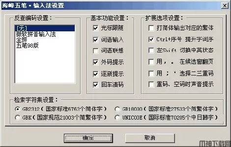 海峰五笔是由孙海峰制作的一款兼容86版以及98版五笔的免费输入法,目前已经收录UNICODE超大字集全部七万多中日韩汉字,可以使用GB2312、GB18030、CJK、Unicode四种字符集的文字进行文字录入,使得像GBK的粤语用字“嘅”