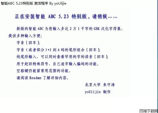 智能ABC5.23特别版是目前为止最好用的智能ABC拼音输入法。智能ABC输入法(又称标准输入法)是Windows系统中自带的一种汉字输入方法。它由北京大学的朱守涛先生发明,被称为标准输入法。智能ABC输入法遵循国家语言文字的规范,按照标准的汉语拼音和汉字笔画书写顺序来处理汉字。它简单易学、快速灵活,因此受到用户的青睐。