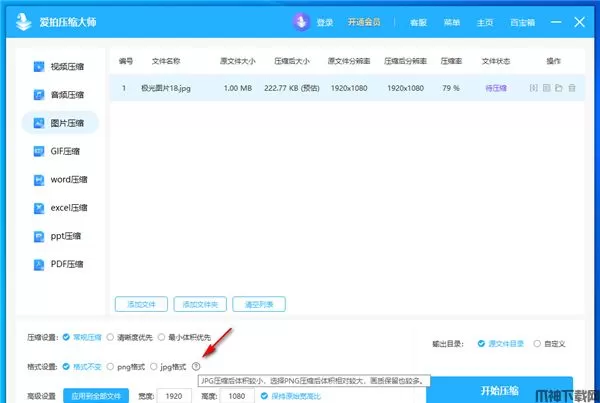 3、可以在软件底部设置压缩方式,可以设置压缩后的格式,JPG压缩后体积较小,选择PNG压缩后体积相对较大,画质保留也较多。