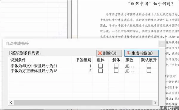 点击后,编辑器将弹出一个“自动生成书签”对话框,上面列出标题格式和标题级别的对应关系(调整列表项的设置可修改书签文本样式)。