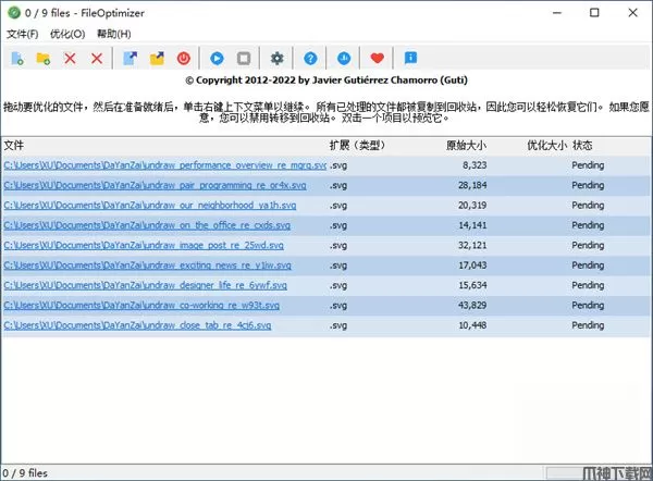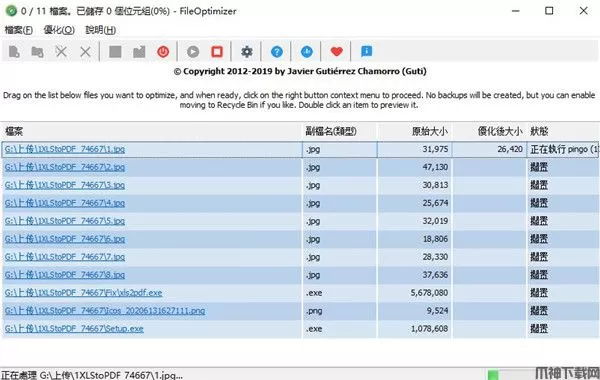FileOptimizer是一款万能开源多格式文件优化工具,软件可以减小很多不同种类文件的体积,支持300种不同的文件格式,比如图片、视频音频、办公文档、压缩文件、exe、文本、代码也就是说平常你遇到的任意格式的文件如果需要压缩它的体积。FileOptimizer可以优化文件压缩,支持各种类型的文件压缩,包括AIR,APK,APNG,APPX,GZ,EPUB,ICO,JAR,JPEG,MNG,CBZ,DOCX,GIF等多种文件的压缩,方便用户对文件进行压缩。fileoptimizer使用非常简单,拖拽文件到软件中即可快速进行压缩,支持导入多个文件进行批量压缩,是文件压缩优化的好工具,用来压缩文件最合适不过了,有兴趣的小伙伴快来下载体验吧!