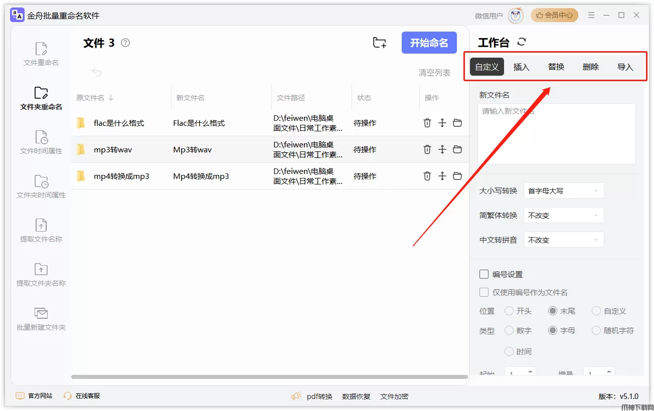 2、在右侧工作台中选择命名方式:自定义、插入、替换、删除、导入。