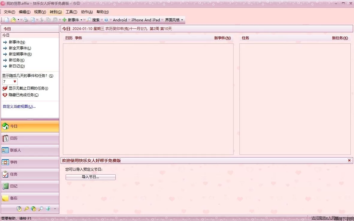 快乐女人好帮手是集通讯录、日程安排、任务计划、公历农历、电子日记、便笺备忘、密码管理、网址收藏等诸多功能于一身的个人信息管理软件。软件具有集成化的界面,统一的操作方式。您无需分别打开几个不同的程序来管理您的个人事务。
