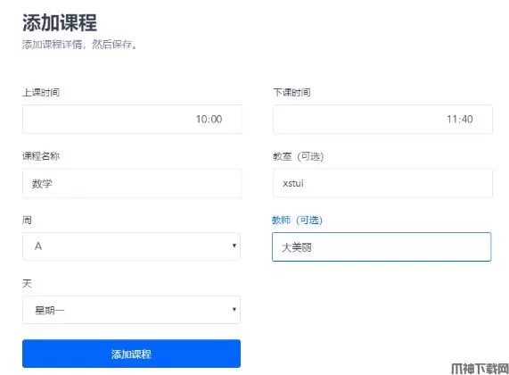 1、选择分类添加对应的项目,课程表按周设置,分为A-Z周,比如将本周的课设置为A,下一周的课设置为B。课程表的上下课时间、名称为必填项,教室和教师选填。