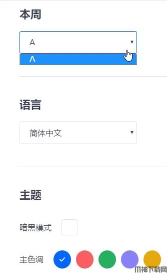 2、删除和重新编辑记得添加完课程后到设置里设置一下本周是哪一周(A-Z),只有在添加课程后才有这一个选项。同时可以设置下主题色等。