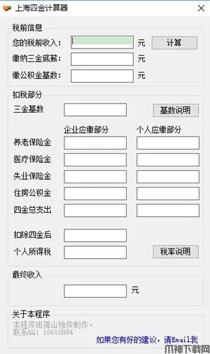 上海四金计算器是一款用于上海四金的计算软件。上海四金计算器软件主要是为养老保险金、失业保险金、住房公积金、医疗保险金打造的计算软件,能够根据用户添加的金额,快速计算出在四金中用户与企业应缴纳的数额。上海四金计算器包括了失业的保险金计算、医疗的保险金计算、住房公积金的计算、养老保险的计算等,也支持进行手动的添加您需要的数值金额来进行计算,计算简单。在上海大部分的企业都已经给员工缴纳五险一金,而且大部分人的工资也已经超过个税最低标准,那么你想知道企业缴纳多少、个人缴纳多少,个税缴纳多少吗?想的话就可以使用这个上海四金计算器进行计算了,免安装,即下即用。你只需要输入工资和基数,就可以得到答案了,非常方便。有需求的朋友请下载使用。