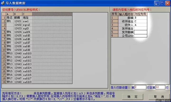 3) 软件弹出表格映射窗口,这是要告诉软件各输入框分别要从表格的哪一列中提取数据(如右下图中,邮编从B列取数据,收件地址从C列,收件人从A列,其他内容框不导入,按默认内容打印。导入行数是从第2行到第12行,共导入11条记录。)