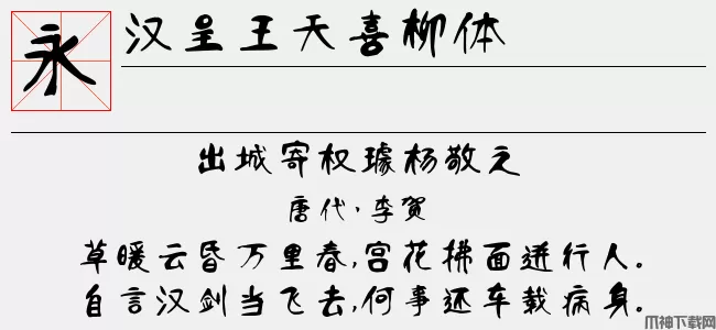 汉呈王天喜柳体字体是由汉呈字库设计师王天喜推出的一款中文艺术字体,其字体整体看上去充满了柳树的特征,字形笔画粗细适中,比较的圆润可爱,并且中英文、阿拉伯数字全面支持,可以很好的应用于文本装潢、信息展示、网页设计、篆刻制模、数据制作、装潢设计、计算艺术设计、视觉设计、字帖等一切合法应用场景,有喜欢的朋友可免费下载收藏。