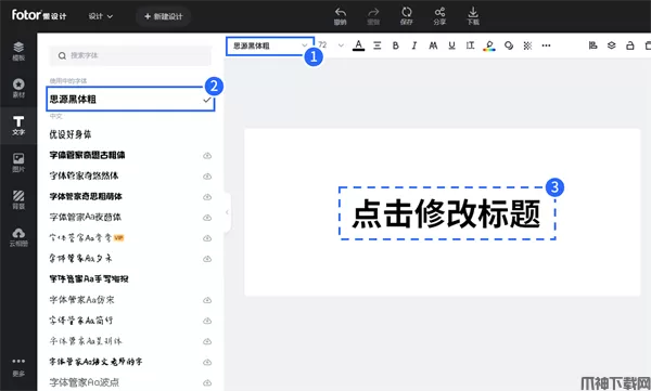 选中文字→点击画布左上角字体→在左侧栏中选中字体→即可应用到文字