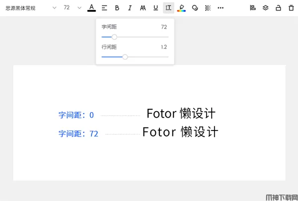 在选中文字状态下,可使用Fotor懒设计文字编辑器,对文字各项参数进行调节