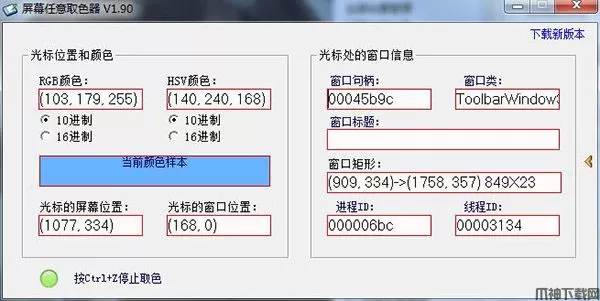 3. 支持RGB颜色和HSV颜色双显示,支持10进制和16进制双选项。HSV颜色模型显示的色调、饱和度和亮度的取值与Windows上的画图程序的取值完全一致。