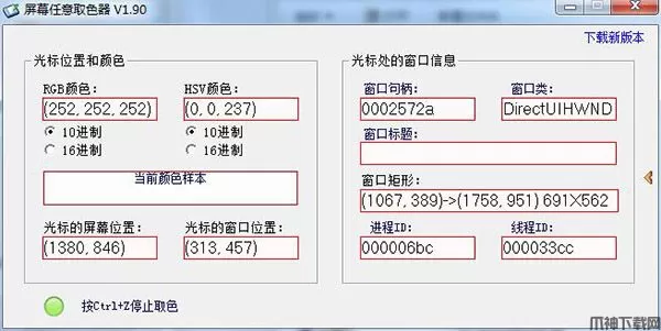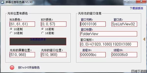 1、屏幕任意取色器界面功能简单,可以立即读取鼠标的颜色