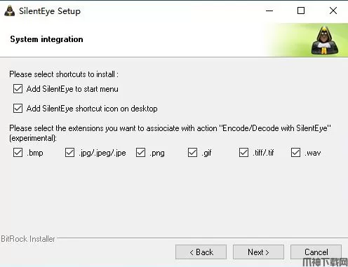 5、勾选“Add SilentEye short icon to you desktop”将程序发送到桌面快捷方式上,同时可自主勾选“Add aSilentEye to statr menu”添加SilentEye开始菜单,建议全部勾选,并勾选相应的关联格式,如bmp、jpg等,为了方便使用也建议全部勾选,完成选择点击Next