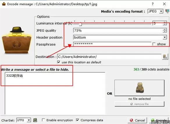 3、在如下图标示的地方输入要隐藏的文本信息,并可在上方进行想要的属性设定,包括Header position标题位置、Passphrase密码、Destination文件保存路径等,这里一定要设置的是Passphrase密码
