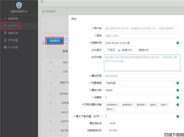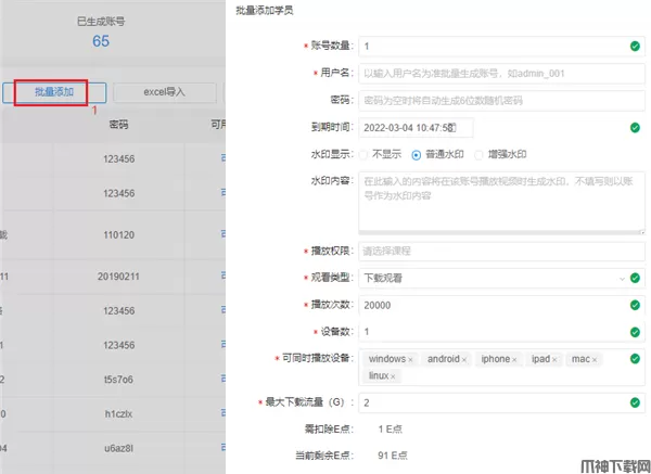批量创建:如果一个班有多名学员同时购买一套课程,单个设置账号密码费时费力。批量添加账号,账号系统自动生成,密码统一设置。
