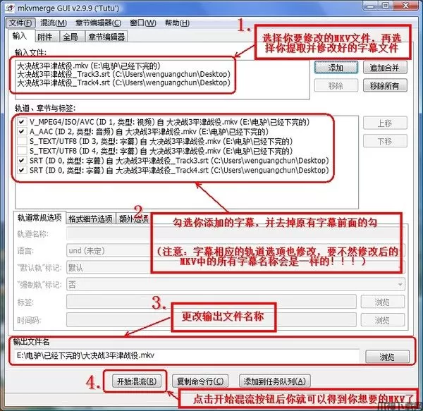 2、提取好字幕后,用MKVtoolnix更改字幕,方法见下图: