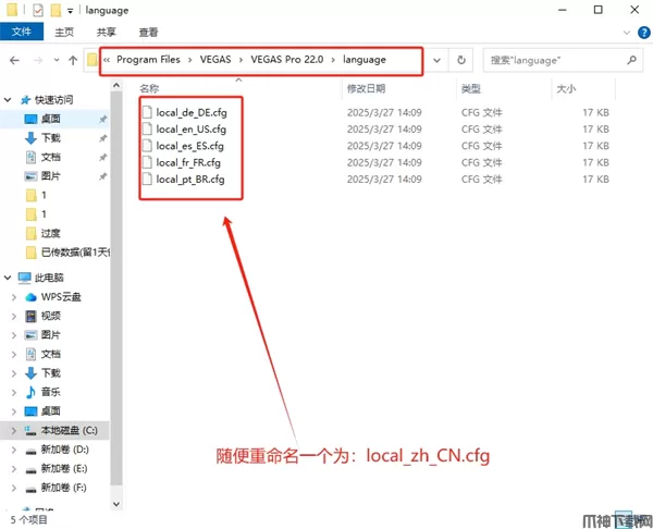 4、紧接着找到软件安装目录,language,把里面任何一个文件改成local_zh_CN.cfg即可;