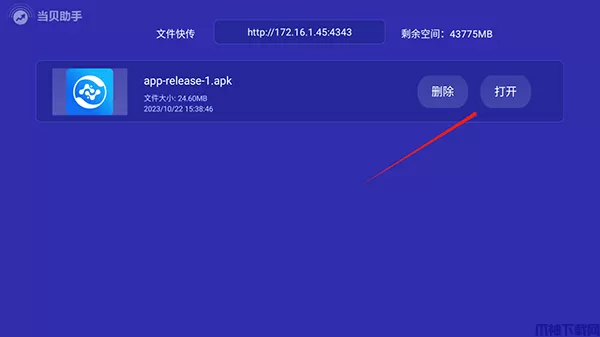 4、上传成功后会直接同步到当贝助手,返回当贝助手中就可以看到已经有文件上传了,这时点击打开即可安装应用