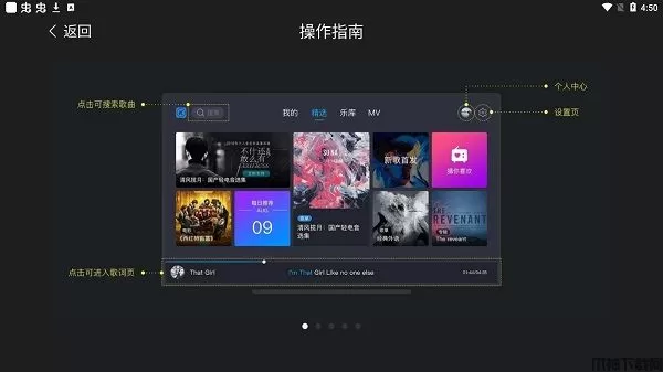 跟随图中的指示,用户可以搜索歌曲,也能点击进入歌词页,同时还能在个人中心和设置选项中进行更多个性化的选项。