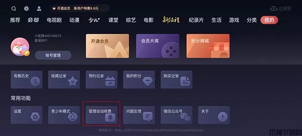 2、进入了”我的“页面后,可以看见包括”观看历史、收藏记录、预约记录、我的积分、购买记录、以及常用功能中的设置、青少年模式、管理自动续费、问题反馈、微信公众号、关于“等功能,我们选择”管理自动续费“