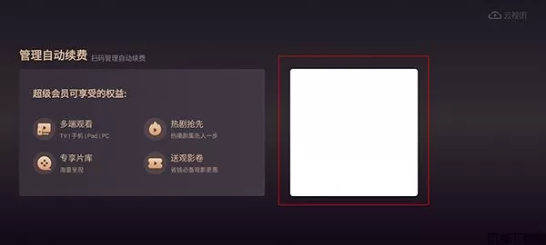 3、点击进入后,左边的是超级会员可享受的权益,右边会出现一个二维码,我们用手机打开微信扫一扫即可进入自动续费的管理页面,由于网站规定,页面不能出现二维码,所以小编已将图片处理了一下,之后根据手机端的提示操作即可