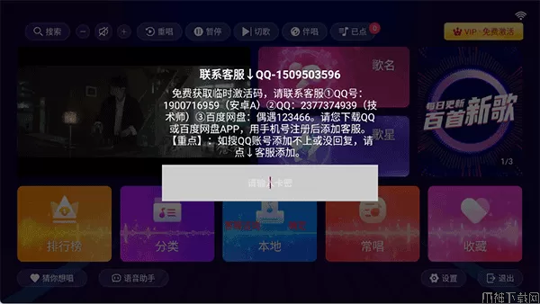 智能KTV点歌机,原名也叫:智能k歌,它是一款专为安卓智能电视设计的点歌机软件,拥有庞大的音乐资源库,实时更新热门歌曲与实时排名,满足用户多样化的K歌需求。智能KTV点歌机软件界面氛围感十足,不仅提供高清MV与高品质音频,带来沉浸式视听体验,还支持多人在线K歌,非常适合家庭聚会时使用,能有效增强家庭互动。同时,智能KTV点歌机具备智能评分系统,能从多个维度评判用户的唱歌水平,助力用户提升唱功。此外,智能KTV点歌机软件还支持自定义音效与背景,用户可根据个人喜好进行个性化设置,让K歌体验更加独特,有需要的用户可以在本站免费下载使用,使用时可以根据软件里的提示获取官方免费的激活码进行免费使用。