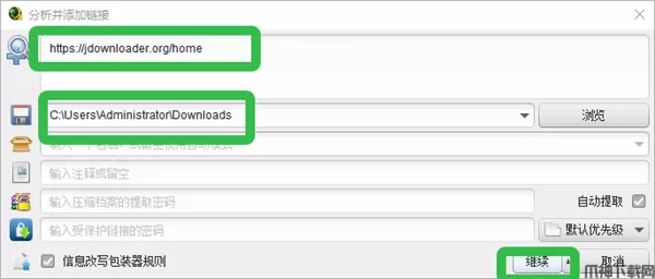 3、复制链接就被粘贴到文本框中,用户可以选择下载位置,然后点击【继续】。