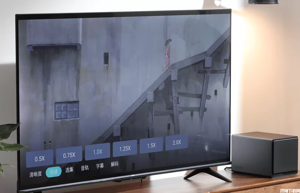绿联云tv版可以调节清晰度,支持倍速播放,遥控器可以直接选集,选择音轨、字幕和解码方式。