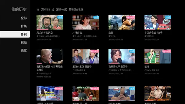 进入历史页面中,按菜单键或者OK键管理历史记录,然后就能选择视频,点击删除即可,想要单个删除视频,长按该视频即可删除。