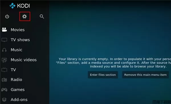 1、新安装好的 Kodi 启动后是英文版的界面,Kodi 包含多国语言,我们可以设置改成简体中文界面,点击设置设置齿轮键;