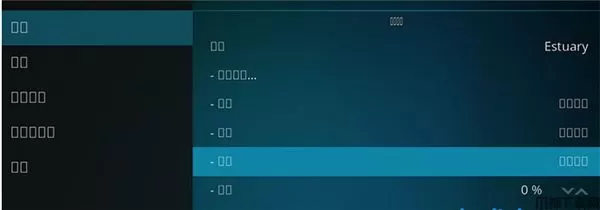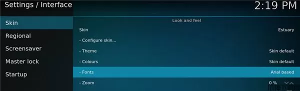 5、如果是不熟悉的皮肤,找到语言设置,Chinese改为English。Skin设为Estuary,Fonts设为Arial,Regional - Language设为Chinese(Simple)。