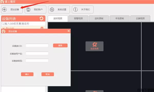 观看端成功登陆以后,如果是一个新账号, 默认是没有设备的,我们需要添加"采集端设备"到设备列表中,Windows观看端,目前只支持手动添加的方式添加,手动输入采集端的cid, 驴名和密码,击"确定",完成对采集端设备的添加。