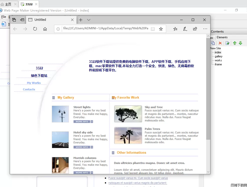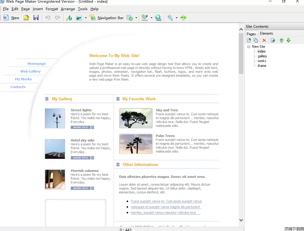Web Page Maker是一个易于使用的网页编辑器,即使是用户不具备专业的编程知识也可以进行编辑,让用户独立制作出一个精美的网页,你只需要拖曳对象到页面中并随意的调整它们的位置即可。