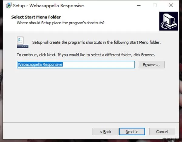 5、提示开始菜单名字设置为WebAcappella Responsive,点击next。