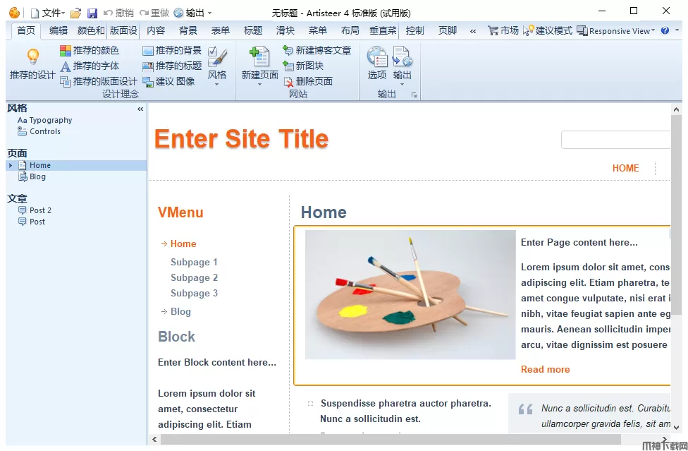 artisteer是一款可视化网页编辑器,也是目前知名的网站模板设计工具。该软件采用了独特的方法,不需要任何编码或CSS的知识,用户只需像使用word一样即可成功设计出专业的网站模板。它可以让你在几分钟内创建WordPress的博客主题和专业水平的网站范本。Artisteer采用独特的方法,不需要任何编码或CSS的知识来设计模板,整个过程完全傻瓜式操作,该计划包括各种背景图片,纹理,照片剪贴画,字体的主题和其它设计元素,以帮助你创建模板,而不需要额外的资源。成品模板可以导出为WordPress的主题或内容管理系统模板.Extensoft Artisteer的软件设计简洁大方,让使用者在设计主题中能够轻松上手。而对于制作WordPress主题,更考虑到每一个页面的各个细节,制作完毕以后,可以直接输WordPress主题包,立刻就可以使用,实在是非常方便。感兴趣的朋友欢迎下载体验!