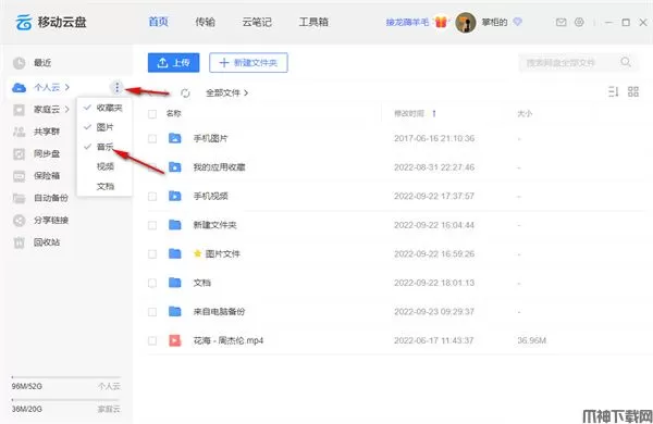 1、进入到中国移动云盘的主页,点击【个人云】后面的三个点,在打开的选项中将【音乐】勾选上。