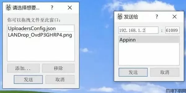 2、而传输文件非常方便,在 Windows 上,只需要将文件拖拽进窗口,再选择设备就行了: