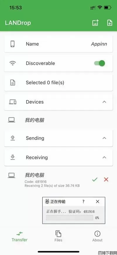 3、最后一步,LANDrop 会出现一个验证码,需要接受端设备确认才开始正式传输文件: