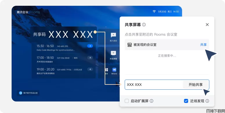 电视上安装并打开Rooms,首页会展示6位字母共享码。手机/电脑端腾讯会议点击【共享屏幕】,输入Rooms的共享码即可发起共享。您也可以在【共享屏幕】页面勾选近场发现功能,并选择所发现的Rooms会议室,即可免输共享码一键共享。