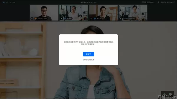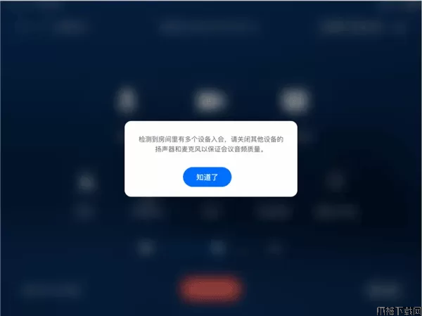 会议中,检测到房间里有啸叫回声,在Rooms 上会自动弹出关闭啸叫弹窗,请将靠近Rooms 的入会设备关闭麦克风和扬声器,以保证会议音频质量。