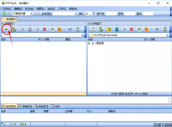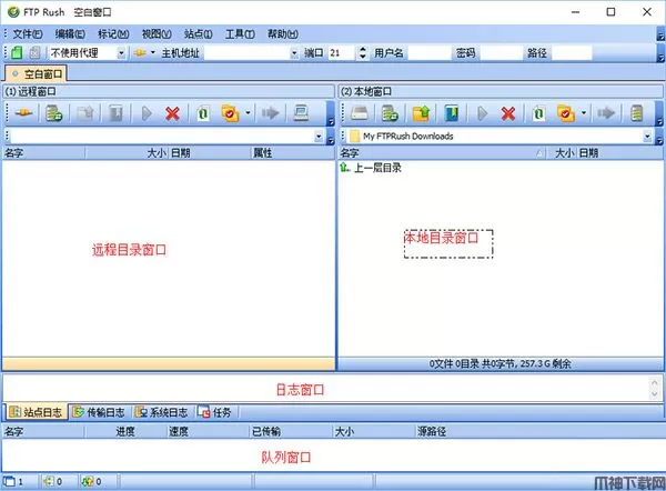 1、双击运行exe软件主程序即可启动打开软件,软件界面窗口分为4个窗口,分别为远程目录窗口、本地目录窗口、日志窗口和队列窗口,如下图所示: